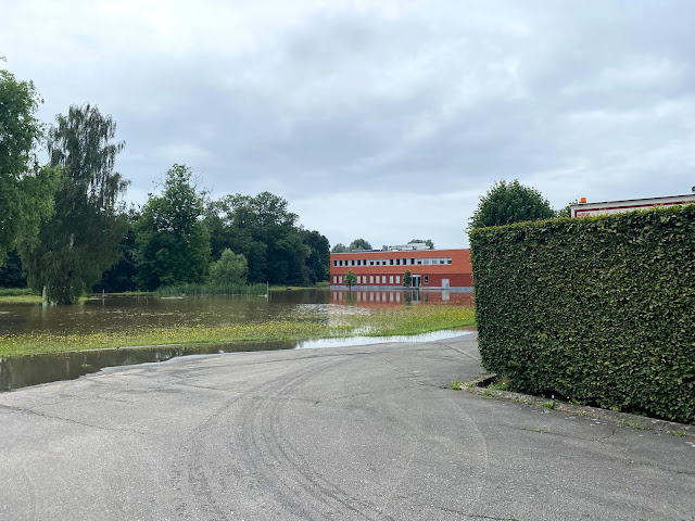 On Thursday the rain line had moved towards the center, which was great news for the disaster area in the East of Belgium. But now we'd take the water load. We got a message from the playground camp that the children attended that they'd be inside but it'd better to wear boots...we followed the guidance. Jan dropped them off ...a full 300m and 500m away and he returned home fully soaked.