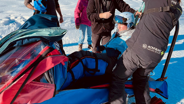 A new transfer to a different stretcher that would roll me in the lift down, and the boys followed a few cabins later. They waved at me when I got transferred to the ambulance stretcher and off we went to Chamonix. On our way I tried desperately to spell to the French nurse my name and address data which turned out impossible if I check the result now on all the data. (hmm would those invoices ever find me?). Many road turns while fully dressed in 2 sweaters and ski jacket and still with my ski helmet on my head, made me arrive in a sweaty nausea panic attack.